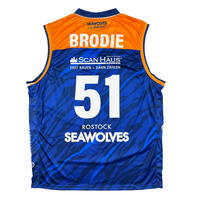 Jeder junge Basketballer träumt davon, einmal als Profi aufzulaufen. Für Darnell Broodie war es im 30-Jahre Jubiläumsspiel gegen Oldenburg soweit. Letztlich schaffte der junge US-Amerikaner den Kadercut nicht und geht jetzt in Rumänien auf Korbjagd. Daher bietet sich jetzt für euch die Chance, sich die original Teamwear von No. 51 zu sichern. Bitte achtet darauf, dass die Trikots von Ausrüster Warrior sehr groß ausfallen und die Größe XL auch problemlos als XXL oder 3XL getragen werden kann. Unsere Pokal-Jerseys gegen die Merlins Crailsheim hatten keine Patches auf der Brust.