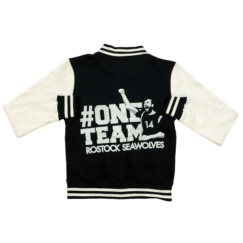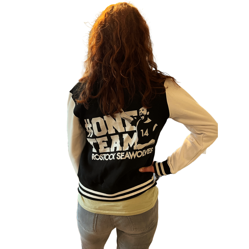 Hol' dir jetzt ein Stück des American Lifestyle nach hause. Mit der Collegejacke deiner Rostock Seawolves machst du immer und überall eine gute Figur. Die Jacke besticht durch einen großen Retroprint im used Look, einer gestickten 94 auf der linken Brust und zahlreichen weiteren Details (siehe unten). Der Backprint #ONETEAM ist ein Stück Zeitgeschichte. Er wurde das erste Mal im Jahr 2014 eingesetzt und zeigt Vereinslegende Jörn Boghöfer.