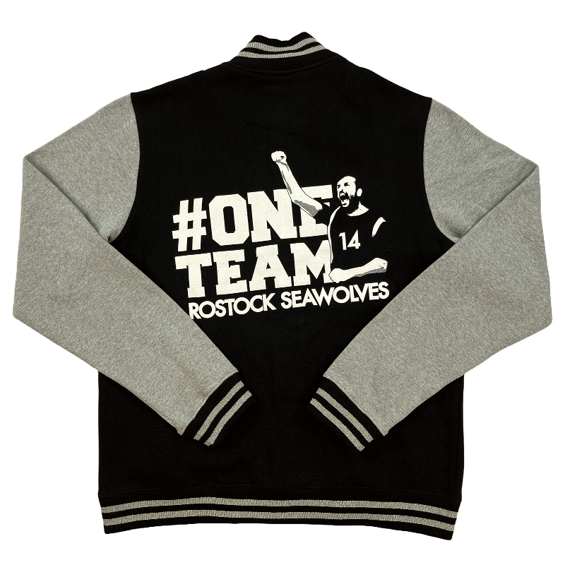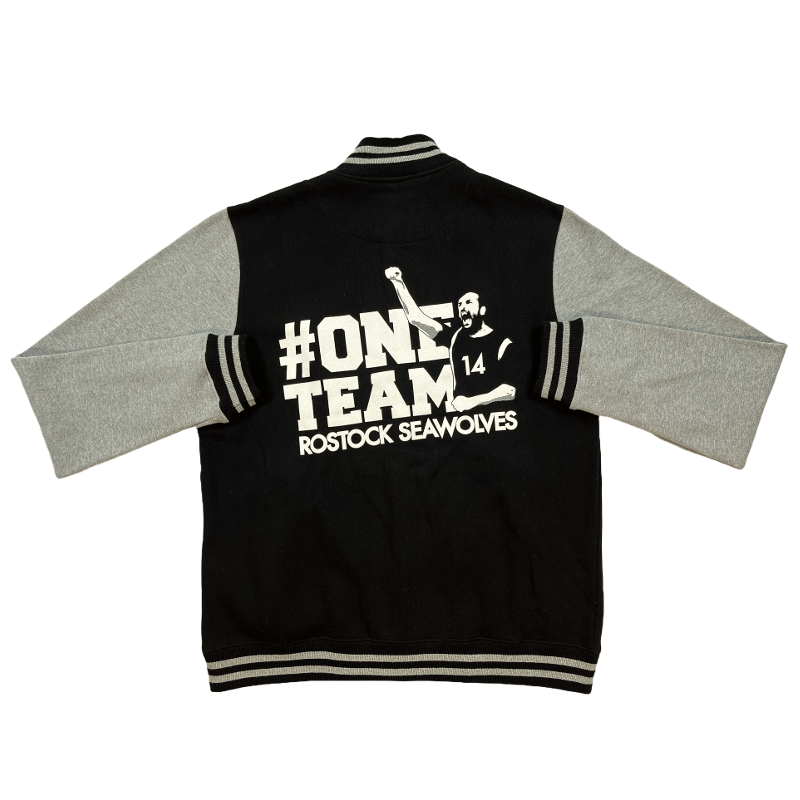 Hol' dir jetzt ein Stück des American Lifestyle nach hause. Mit der Collegejacke deiner Rostock Seawolves machst du immer und überall eine gute Figur. Die Jacke besticht durch einen großen Retroprint im used Look, einer gestickten 94 auf der linken Brust und zahlreichen weiteren Details (siehe unten). Der Backprint #ONETEAM ist ein Stück Zeitgeschichte. Er wurde das erste Mal im Jahr 2014 eingesetzt und zeigt Vereinslegende Jörn Boghöfer.
